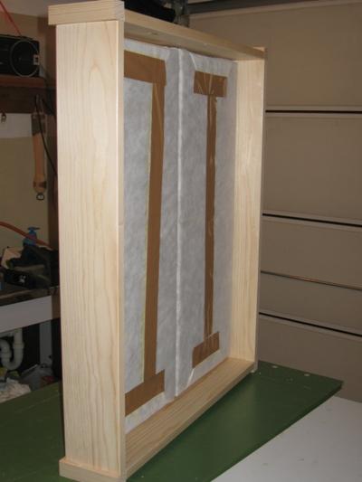 Takole izgleda absorber s sliko. Za platnom je tudi absorbcijska plošča debeline cca 2,5 cm (mere notranjega prostora okvirja slike so 51 x 38 cm)