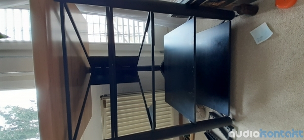Doma narejeno hi-fi stojalo. Višina od tal do vrha lesene plošče: 83 cm. Masivna vrhnja lesena plošča dimenzij 71 X 58 X 3cm. črne vmesne plošče 50 x 37 x 1 cm. vmesne višine - zgoraj obakrat 15 cm, spodaj obakrat 19 cm. Železne cevi so votle, napolnjene s posušenim peskom. | ![]() |