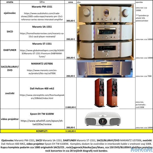 Ojačevalec Marantz PM-15S1, SACD Marantz SA-15S1, DABTUNER Marantz ST-15S1, SACD/BLURAY/DVD MARANTZ UD7006, zvočniki Dali Helicon 400 mk2, video projektor Epson EH TW 6100W. Kompletu dodam še kompletne zvočniške in interkonekt kable. Kupcu kompleta podarim cca 1000 originalnih SACD/CD , rock/jugorock/klasika/jazz/blues in cca 150 DVD/BLUERAY ploščkov pretežno rock koncertov. | ![]() |