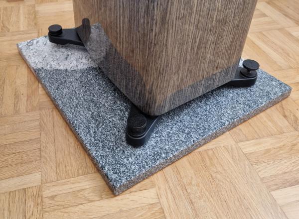 Pri marmorni/granitni plošči je potem potrebno poskrbeti za spoj marmorja/granita s tlemi tako da si zopet na začetku problema. Ne vidim nobene dodane vrednosti. Bolje dati marmor/granit na zvočnik.