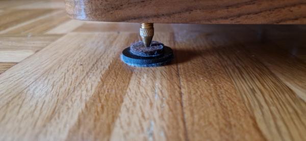 Za začetek sem zaradi lažjega premikanja po parketu zvočnike s podstavkom dal na 4mm debelo plutovinasto ploščo. Danes pa sem podstavke prilepil gumijaste podloške in jih dal direkt na parket. S tem nisem zadovoljen, ker se zvočniki precej zibajo in niso stabilni.