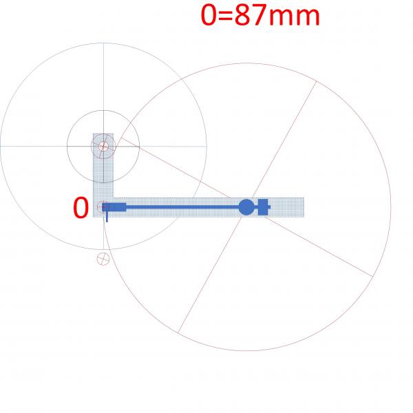 Zdaj, ko je ničelna pozicija določena, vsi tisti ki se hočete pridružiti "oranju", ni treba nič vedeti o matematiki, to sodi v računstvo 7. ali 8. osnovne. Če imate možnost manipulacije z ročko, zadostuje milimeterski papir. Luknjica velikosti 7.2 mm in na isti črti, 87 mm od sredine, luknjica za iglo, pravokotno na to linijo postavite ročko in to je to.(slika) Nobenega underhanga ni potrebno računati in pozabite na Pitagoro. Če pa koga zanima koliko bi bila potrebna ef. dolžina ročke za minimalna odstopanja, da igla "potuje skoraj ravno" po liniji radija, mala malica, ca 3m in kakšnih 20 cm, tako za informacijo, če bi si kdor kaj takega omislil. Vsekakor, nasadilo od običajne metle bi bilo prekratko.