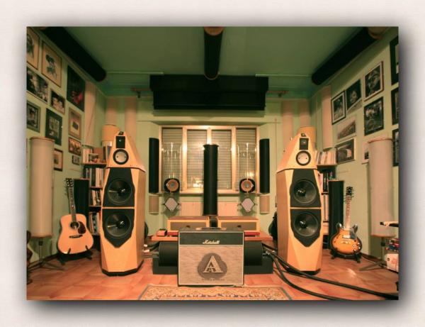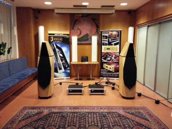 To rabi vsaj 50 ali več m2, s tretiranimi koti in prvim stranskim odbojem, ne goro bas trapov, poiskati pravi sweet spot na razdalji (to niso monitorji),nekoliko dvignjen ,da pridemo z ušesi bliže višini srednjetoncev...Zaigrati mora cel prostor.. Na Spectral in 120W ojačevalce lahko pozabite, priklopite kvaliteten lampaški pred (da "oživi pravilno" keremiko), končna pa v stilu big Krell top ampov ali ojač.podobnih karakteristik na bas področju, z pravo rezervo watov,oz amperov...In "težave in kritike" slišane na sejmu "izpuhtijo"...lp |