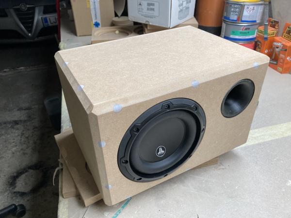 cez weekend je bila narejena majhna portana skatla za JL AUDIO 6w3V3 za pod sovoznikov sedez. 10 litrov, aeroport, stojne matice, Silent coat damping plošče, 1,5 cm pena, pobrani robovi pod 45 stopinj, CNC razrez...
