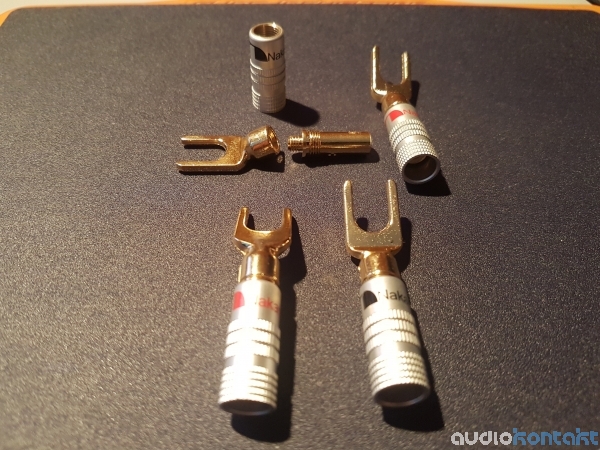 Prodam 4 nove, nerabljene konektorje vilice Nakamichi. 2x črna oznaka 2x rdeča oznaka. Konektorji so masivni in pozlačeni. Zvočniški kabel se lahko terminira s privijanjem dveh vijakov. Slika je dejanska slika izdelka.   | ![]()  |