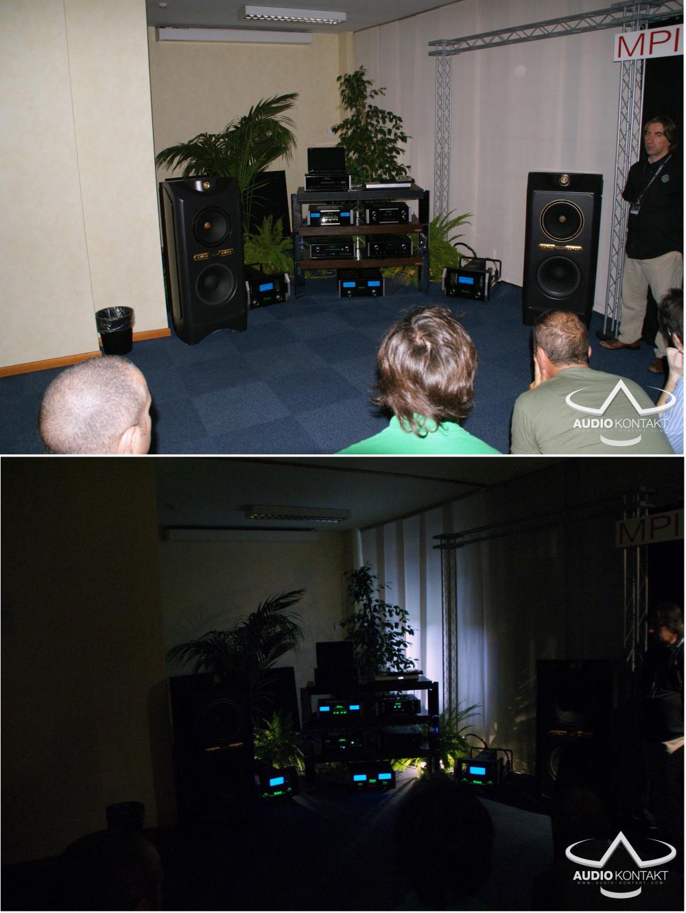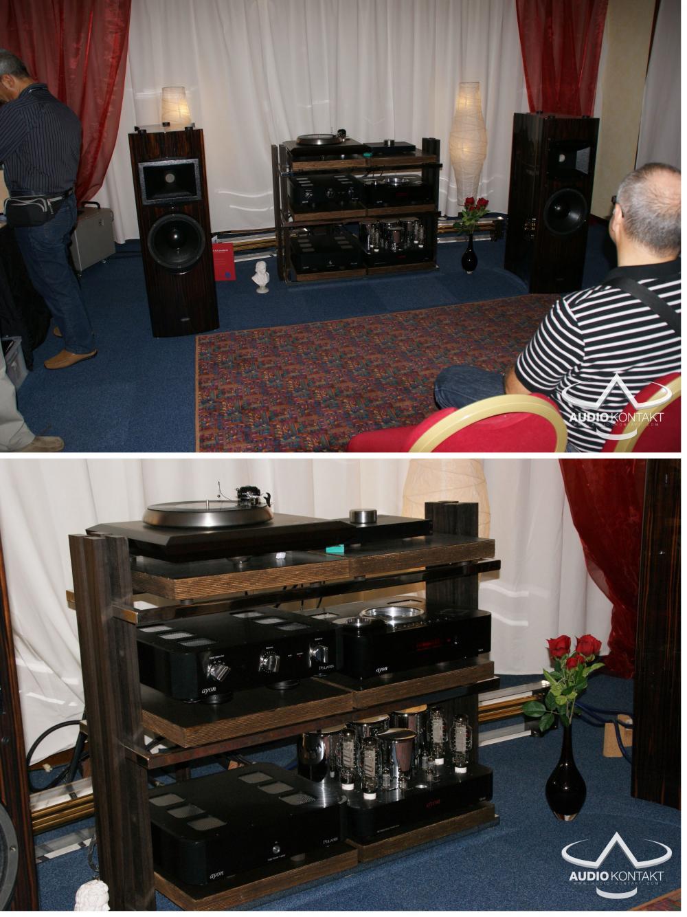 Sound Lab – Vyger – Cat – Perreaux - Transparent. Ta sistem je bil med največjimi razočaranji sejma. Če bi primerjal zvok prejšnjega z zvokom tega sistema, bi lahko dejal, da je prejšnji, Monrio – King, » best buy za 15 zvezdic« . Sound laba še nisem slišal slabše igrati. Zvočniki so bili preveliki za ta prostor, zvok se ni niti za cm odlepil iz zvočnika, frekvenčna linija je bila kot »Himalaja« -gor in dol, bilo ni nobene dinamike … z eno besedo: sploh ne moreš iskati pozitivnih lastnosti. Obiskovalci so samo stopili noter in takoj ven, nihče se sploh ni usedel in poslušal. Sam sem iskal optimalno pozicijo za poslušanje, a je bilo povsod enako !!!... »Drugo mnenje« grd zvočnik, »kot spovednica, iz katere uhaja zvok«.