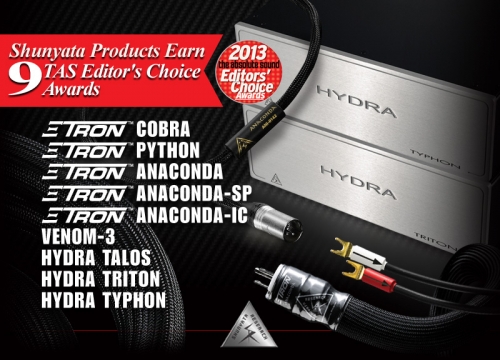 Shunyata Research izdelki so bili vedno med najbolj priljubljenimi pri The Absolute Sound kar letošnje Editor's Choice Awards potrjujejo. Skupaj devet (9) TAS nagrad je bilo podeljeno Shunyata Research izdelkom: ΞTRON Anaconda zvočniškem kablu, Venom-3, Cobra, Python i Anaconda električnim kablom, ter Hydra Triton, Hydra Typhon i Hydra Talos električnim filtrom.