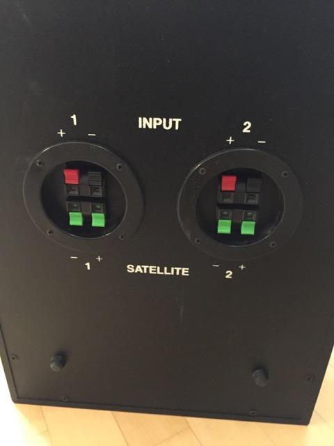 Oba satelita (levi in desni) na sub na zelene konektorje. + na subu (zeleni konektor) povezes s + rdeci konektor na satalitu; - na subu (zeleni konektor) povezes z - crni konektor na satelitu. To storis najprej za levi nato za desni satelit.