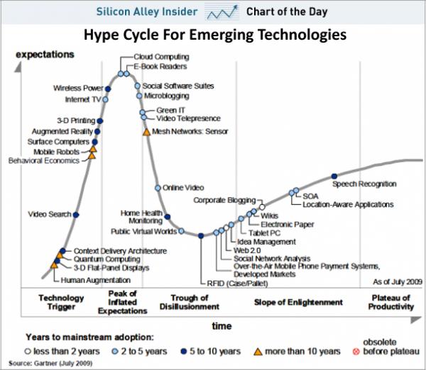 Since 1995, Gartner has used hype cycles to characterize the over-enthusiasm or "hype" and subsequent disappointment that typically happens with the introduction of new technologies.[2] Hype cycles also show how and when technologies move beyond the hype, offer practical benefits and become widely accepted. According to Gartner, hype cycles aim to separate the hype from the reality, and enable CIOs and CEOs to decide whether or not a particular technology is ready for adoption. A longer-term historical perspective on such cycles can be found in the research of the economist Carlota Perez.