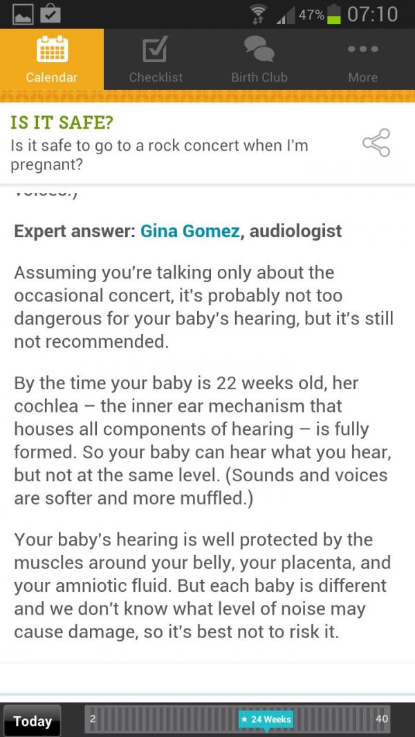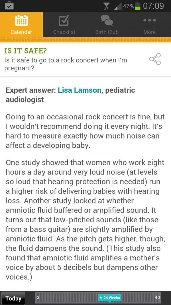 Jaz sem recimo danes izvedel - no res da v tej smeri nisem nikoli vrtal, ta aplikacija pa mi je zanimivost servirala na pladnju... ono ko pravijo, da otroček v bušiju točno razloči glas matere od ostalih glasov oziroma hrupa okolice. Odgovor razberem iz odgovora strokovnjakinje na vprašanje ali nosečka lahko hodi na glasne koncerte. Strokovnjakinja med drugim pove, da tekočina v plodovnici ojača materin glas za 5 decibelov, dočim zunanje glasove/hrup duši. Evo: