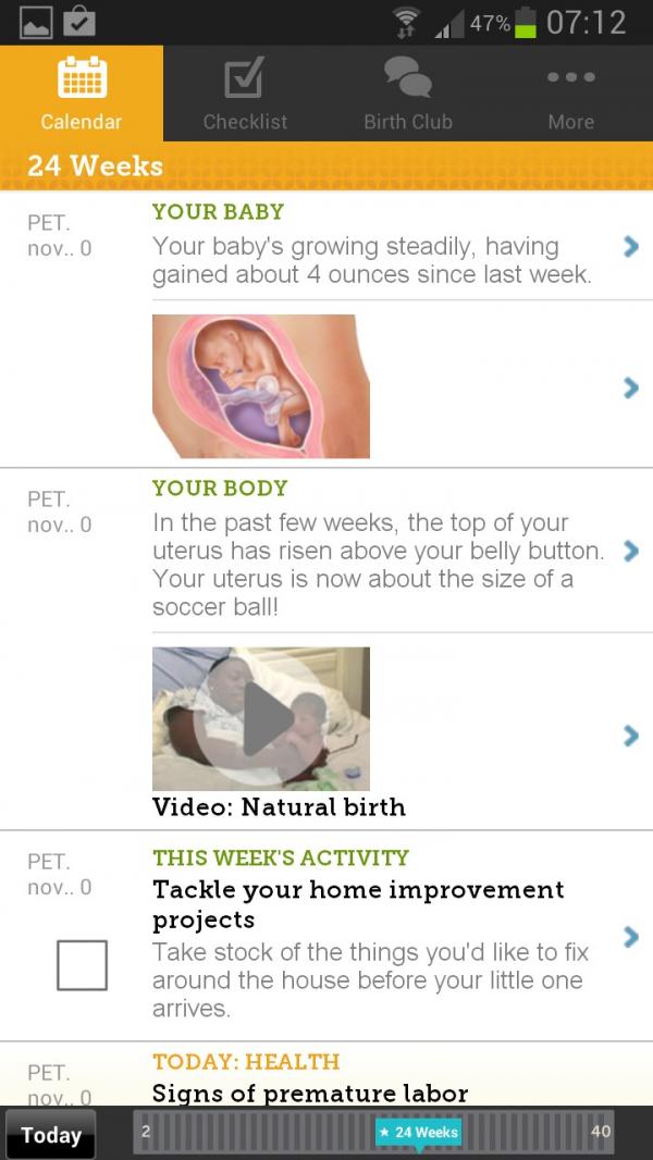 Vpišeš notri predviden datum poroda in aplikacija na fončku/tablici odšteva dneve do srečnega dogodka, te seznanja kaj se z otročkom dogaja v bušiju v posameznem tednu, kateri organi se mu razvijajo, kako intenzivno mora brcat da veš da je okej, video prikazi razvijanja po tednih, odgovori na pogosta vprašanja v določenih tednih nosečnosti,... skratka en tak lušten pripomoček v nosečnosti.